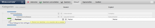 Indem Sie die linke Maustaste bei Klick auf das Struktureditorsymbol Icon eines Kategorieneintrages gedrückt halten, können Sie einen Kategorieneintrag verschieben. An den Stellen, an denen ein Einfügen möglich ist, erscheint ein blau gestricheltes Rechteck. Bei Überfahren eines dieser blau gestrichelten Rechtecke mit der Maus färbt sich dies grün ein, was signalisiert, dass der zu verschiebende Eintrag hier eingefügt werden kann. Dazu lassen Sie die linke Maustaste an der Stelle wieder los.