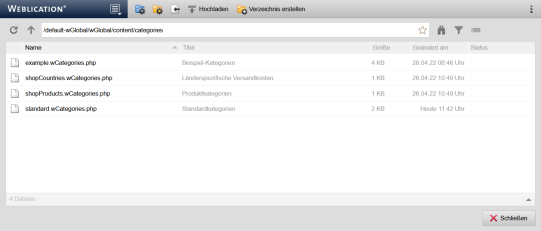 Bei entsprechender Berechtigung ist im Weblication® Panel unter "Globale Inhalte" die Schaltfläche zum Aufruf der "Kategorien" ersichtlich. Einem Pflegebenutzer kann die Schaltfläche angezeigt werden, wenn das Verzeichnis der Kategoriendateien ein Ansichtsrecht für den Benutzer gesetzt hat. Sollen alle darin befindlichen Kategoriendateien vom Pflegebenutzer bearbeitet werden können, vergeben Sie zum Verzeichnis über die Standard-Dateieinstellungen die erforderlichen Bearbeitenrechte. Sofern dies nur für bestimmte Kategoriendateien freigegeben werden soll, erledigen Sie dies über die Datei-Eigenschaften (Rechte) der gewünschten Kategoriendatei.